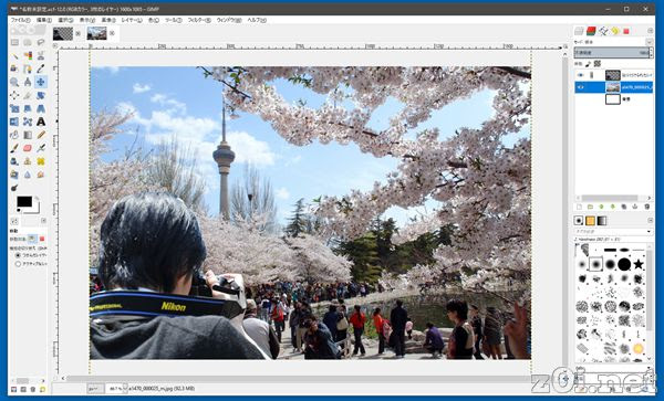 合成したい写真を別のレイヤーに読みこみます。レイヤー部分の「目」のアイコンのようなものをクリックすると、そのレイヤーの表示・非表示が切り替えられます。
