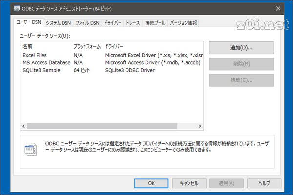 うまく行くとこういう画面になるかと思います。今回作成した「SQLite3 Sqmple」を選択して、「構成」ボタンを押すと、設定変更できます。間違えた場合はそこで修正が可能です。